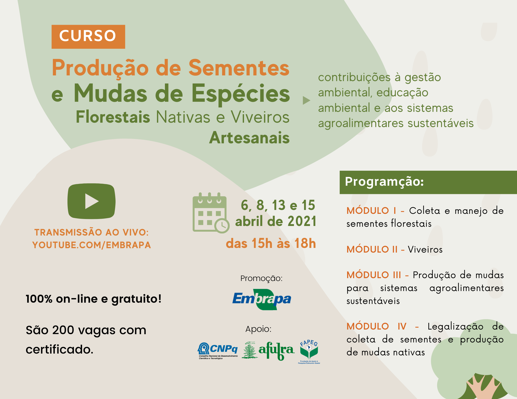 Inicia nesta terça-feira, 06, o curso on-line sobre Produção de Sementes e Mudas de Espécies Florestais Nativas e Viveiros Artesanais promovido pela Embrapa Clima Temperado (Pelotas, RS), com apoio do CNPq, Afubra e Fapeg. Ao todo, serão quatro módulos, nos dias 6, 8, 13 e 15 de abril. As lives serão realizadas das 15h às 18h, no canal da Embrapa no YouTube.