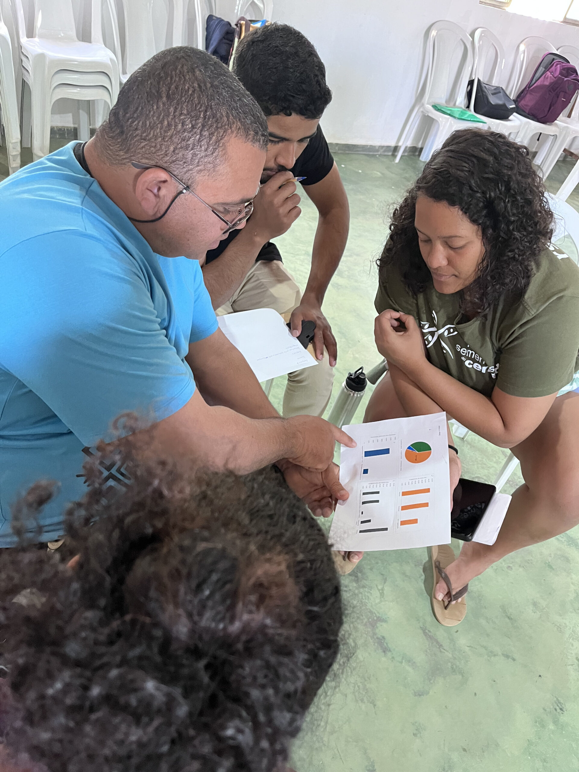 Posteriormente, a capacitação avançou para a análise dos dados coletados. Os participantes aprenderam a interpretar gráficos e tabelas gerados pelo monitoramento e a tomar decisões a partir deles. “Um dos diferenciais do encontro foi a capacitação das comunidades para irem além da coleta de dados, envolvendo-as diretamente no processo de análise e tomada de decisão. O objetivo foi treinar o olhar dos participantes para que, após o monitoramento em campo, eles mesmos possam interpretar os resultados e responder perguntas como: O que estes dados significam? e Qual o próximo passo?. Ao analisar gráficos e tabelas, os restauradores puderam diagnosticar a saúde do ecossistema e decidir com autonomia sobre as ações necessárias, como a implementação de um novo manejo, o enriquecimento com mais espécies ou a realização de um replantio pontual, tornando-se, assim, protagonistas em todo o ciclo da restauração”, destaca Maria Eduarda.