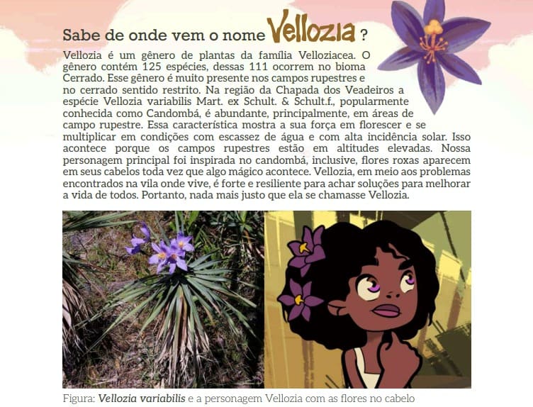 A bióloga ressalta que o material foi criado para auxiliar professores a explorar todo o potencial da animação, oferecendo sugestões de atividades interdisciplinares para o ensino fundamental 1 e 2. “Nesta apostila também temos um resumo da animação Vellozia e a descrição dos personagens. Com planos de aula detalhados e sugestões de atividades e oficinas, a apostila torna mais fácil integrar a animação em diferentes disciplinas, como Ciências e Geografia”, destacou.