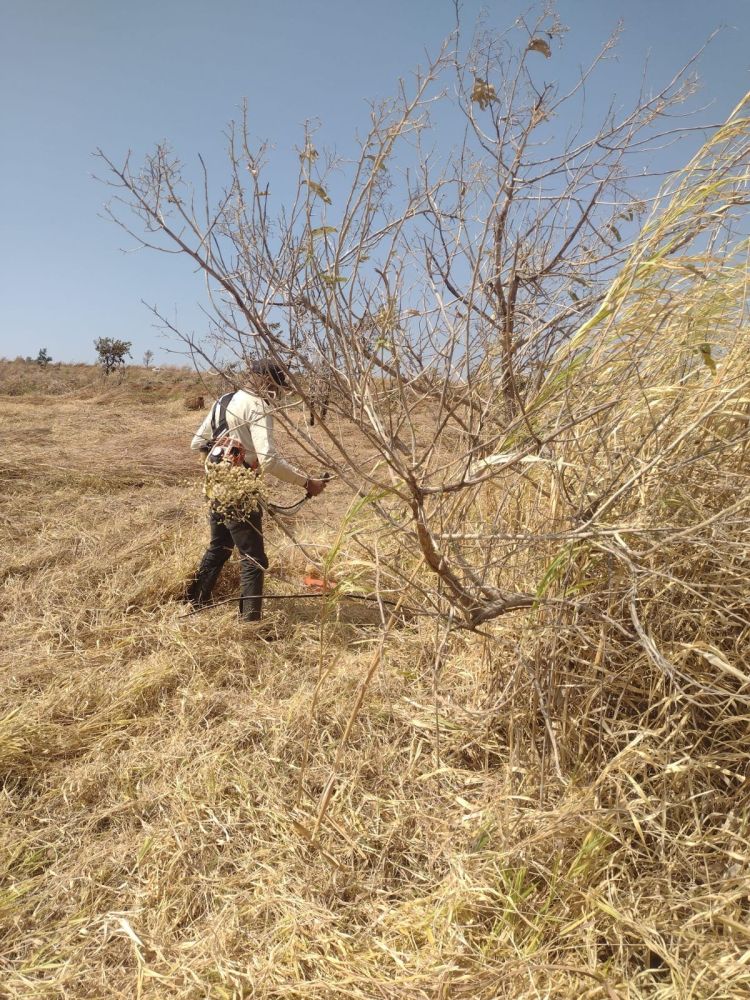 Técnico em restauração do projeto, Henrique Santos explicou que o trabalho foi realizado em etapas. “Preparamos o solo com o arado e agora estamos controlando as Espécies Exóticas Invasoras. Em parte da área, utilizamos herbicidas, e em outra, devido a proximidade a um campo úmido, realizamos a roçada para evitar a competição entre as plantas nativas e as invasoras”, explicou o técnico em restauração. A ação visa preparar o terreno para o plantio de espécies nativas do Cerrado, como também garantir que essas plantas possam se desenvolver.