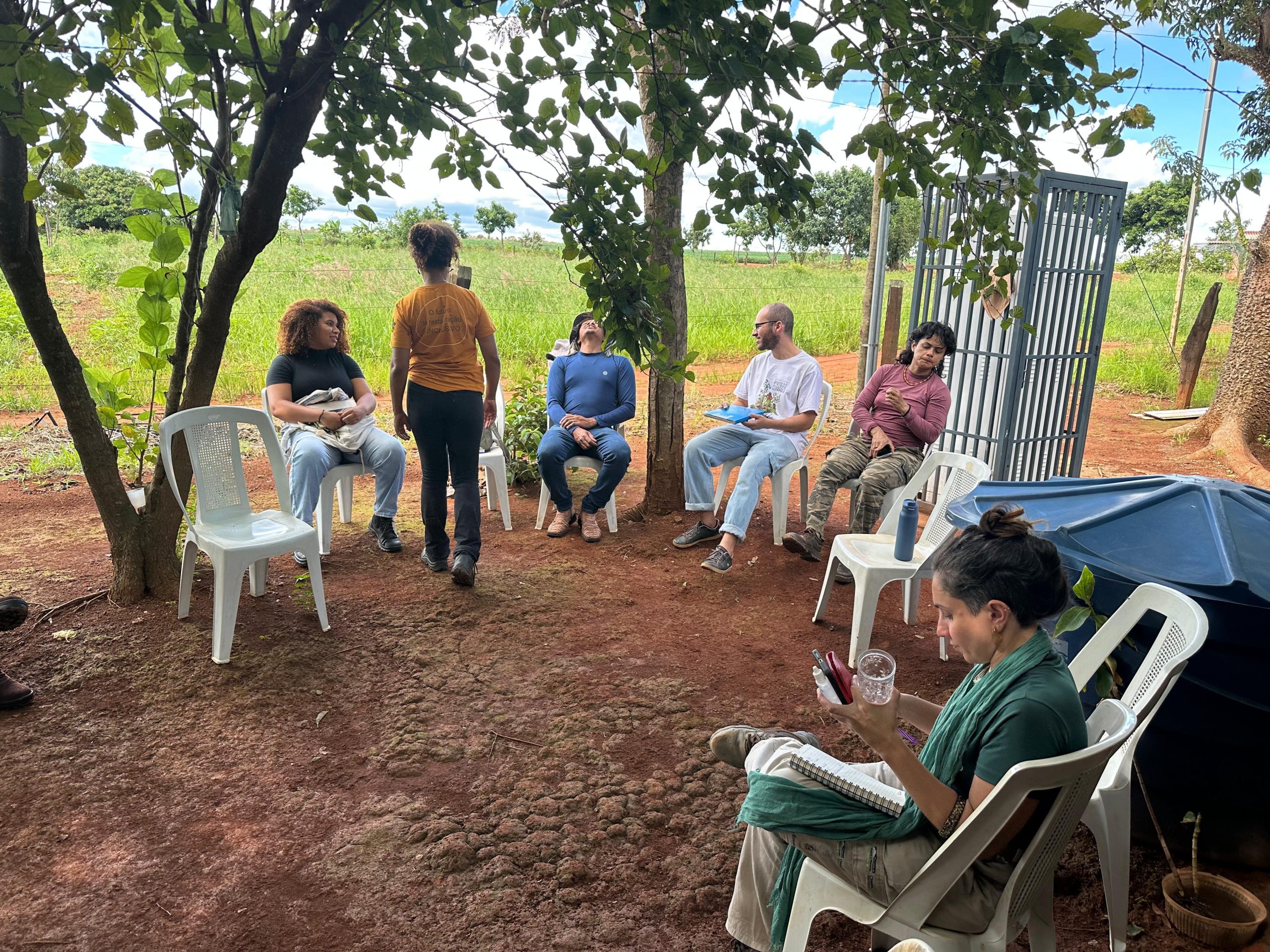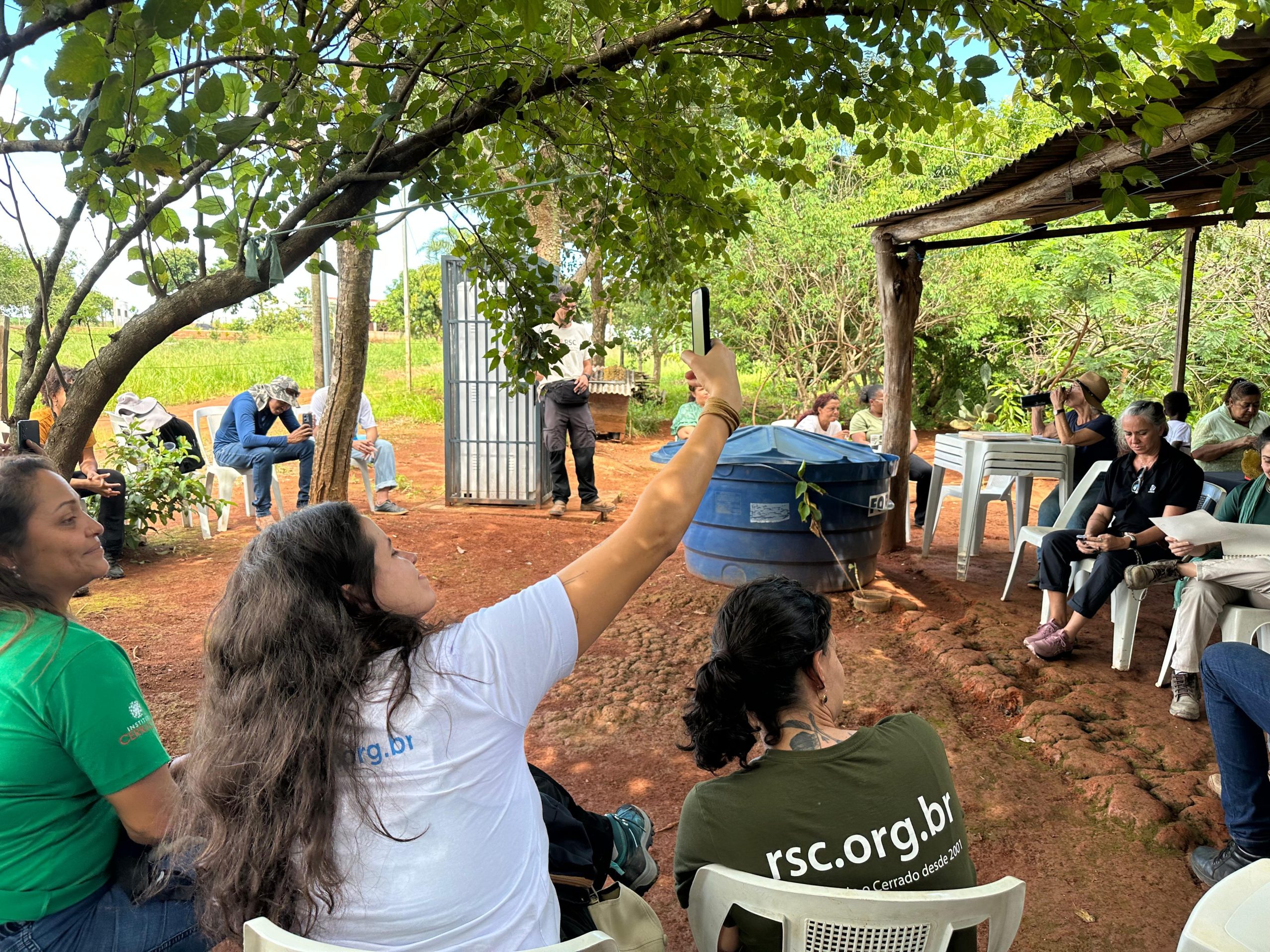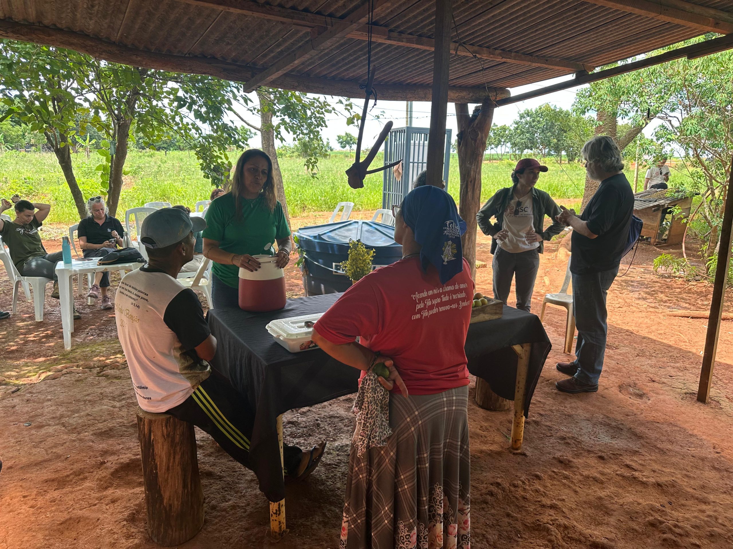 A atividade foi iniciada com uma roda de conversa, conduzida pela equipe da RSC que abordou sobre os SACEs, seus princípios, objetivos e como vêm sendo implementados no Assentamento como alternativa de restauração produtiva. “Falamos sobre o protagonismo das sementes e espécies nativas do Cerrado, geração de renda para as famílias e conservação ambiental. A discussão coletiva desses temas contribui para alinhar expectativas, esclarecer conceitos e fortalecer a compreensão de que a restauração proposta pelo projeto vai além da recuperação ambiental, integrando produção, participação social e geração de conhecimento”, explicou Jimena Stringuetti , Coordenadora do Núcleo de Projetos da RSC.