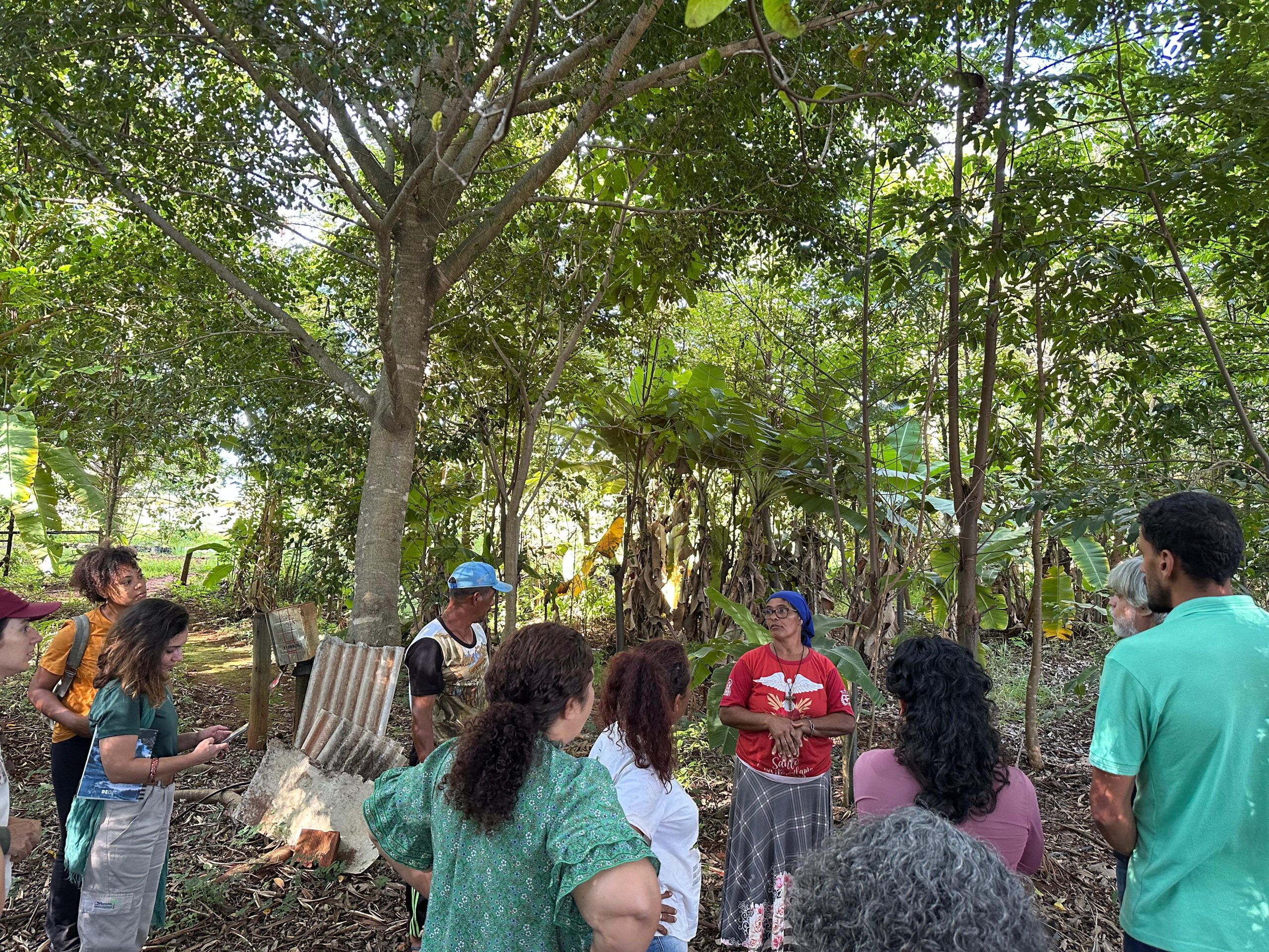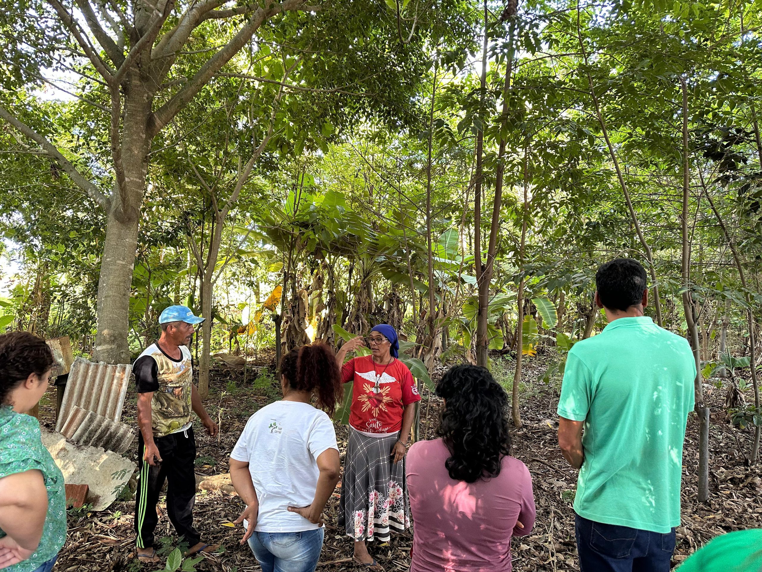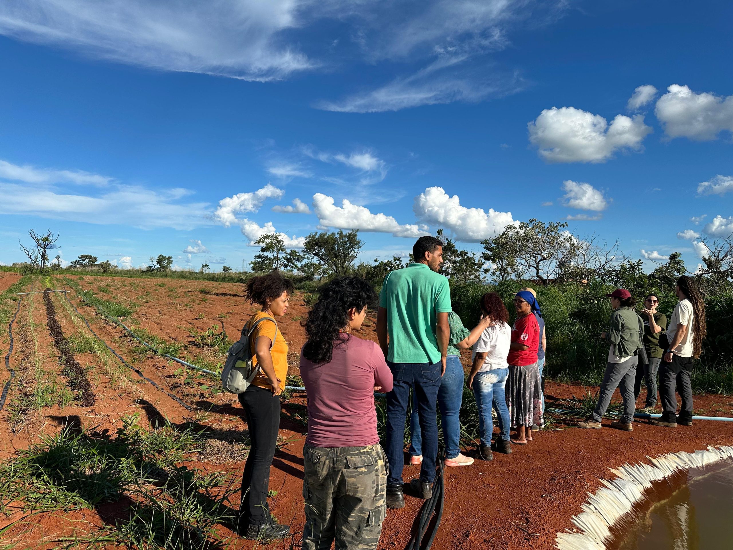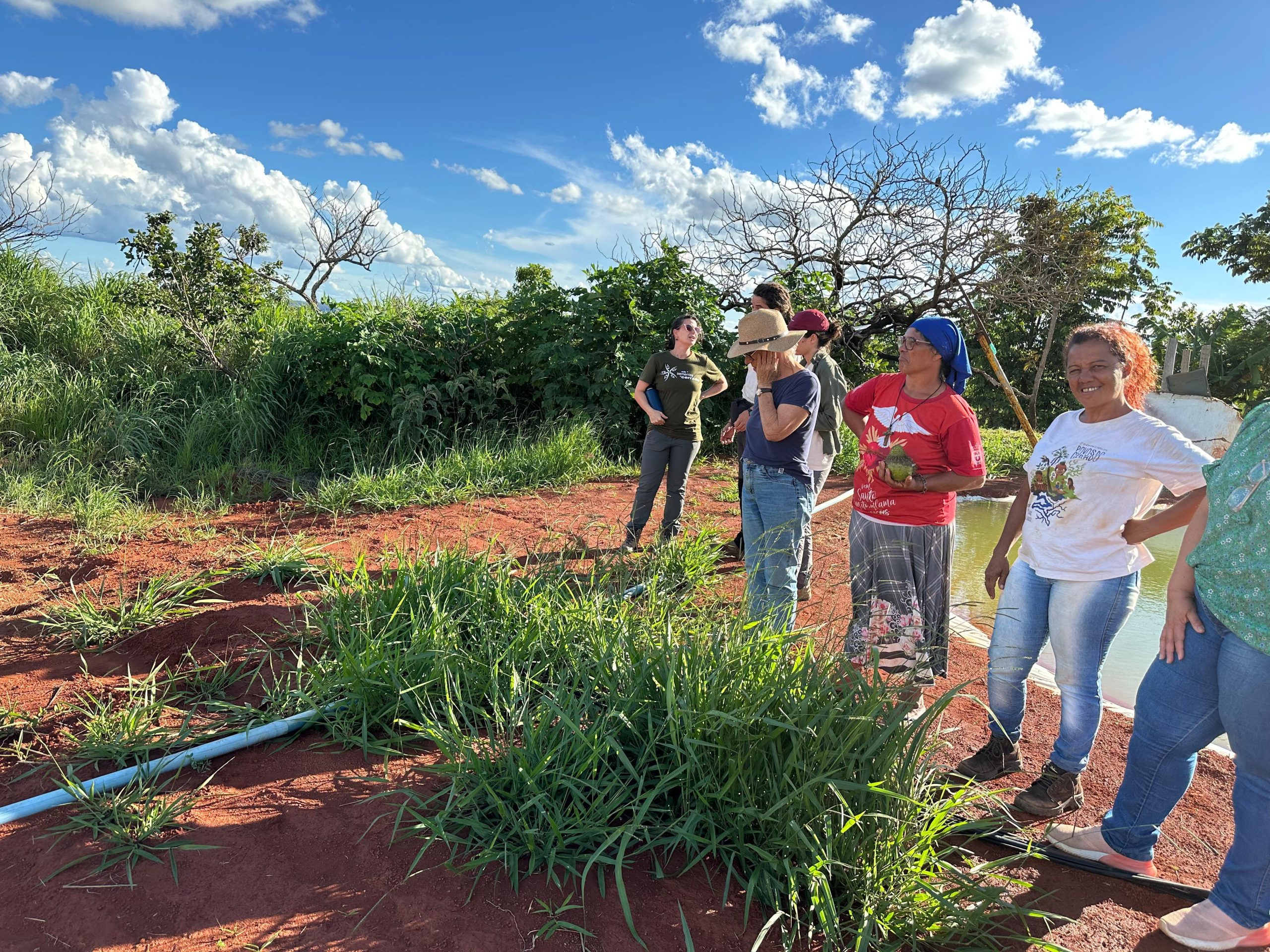 Para apresentação do sistema produtivo, os participantes realizaram visitas em duas áreas. Estiveram na propriedade da Dona Inês Santos e seu Sandro Santos, bem como da dona Emilene Paiva, onde foi possível conhecer outro contexto de implantação dos SACEs e participar de uma muvuquinha com o plantio coletivo de sementes nativas do Cerrado.