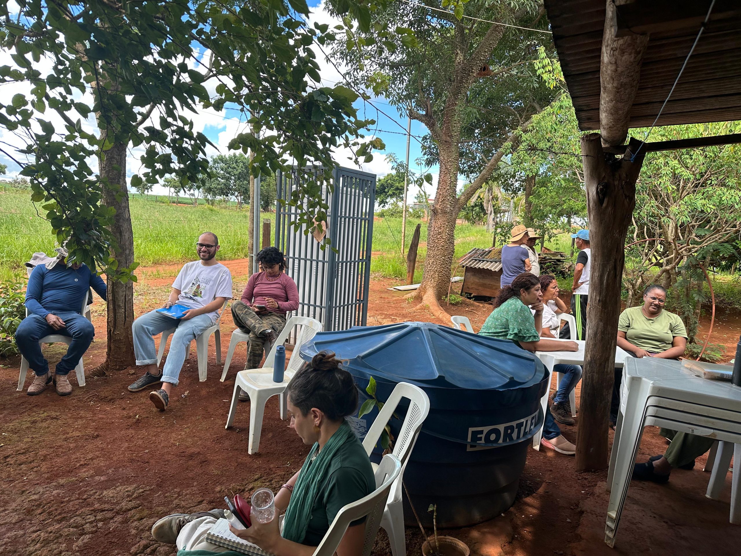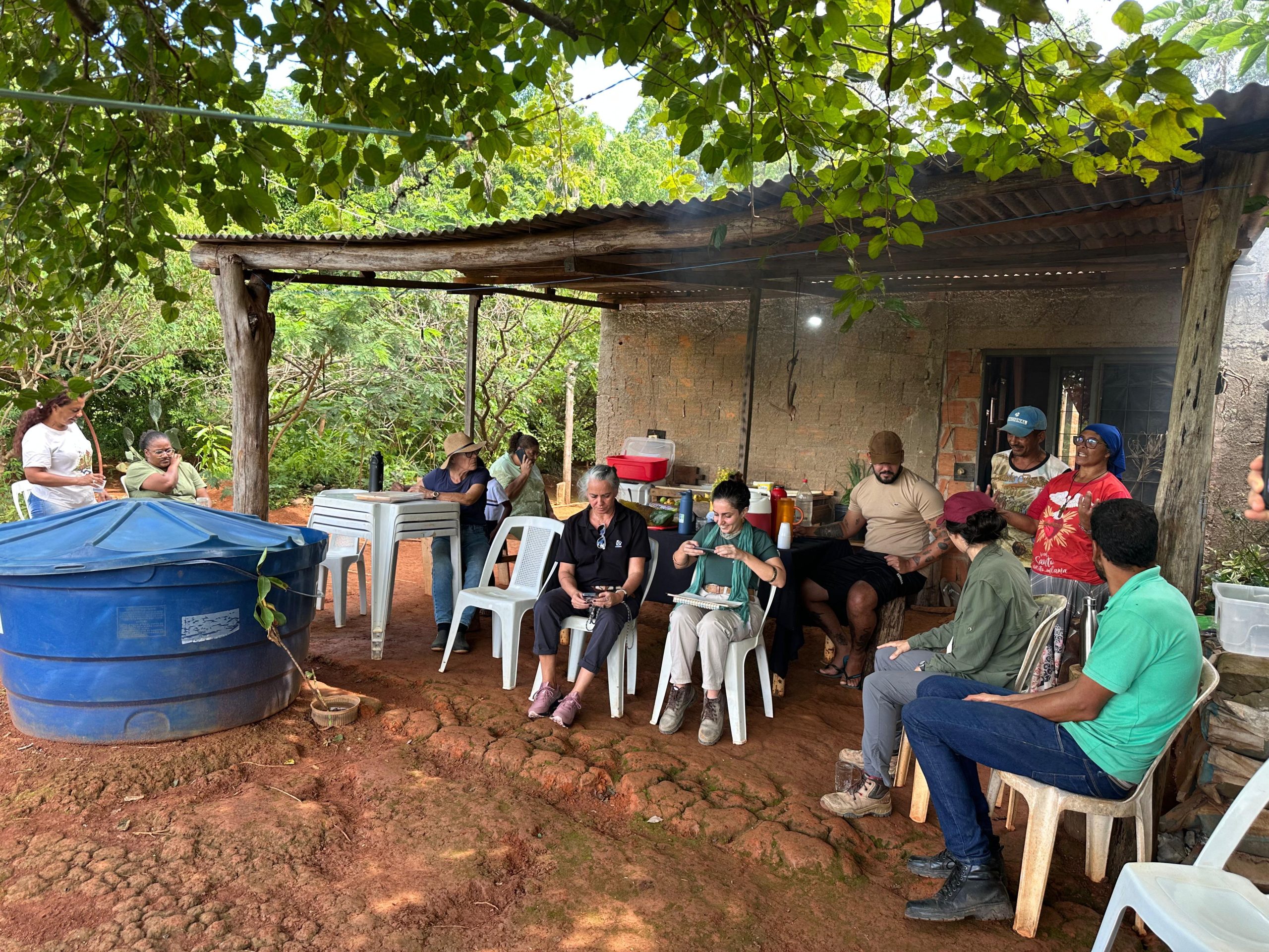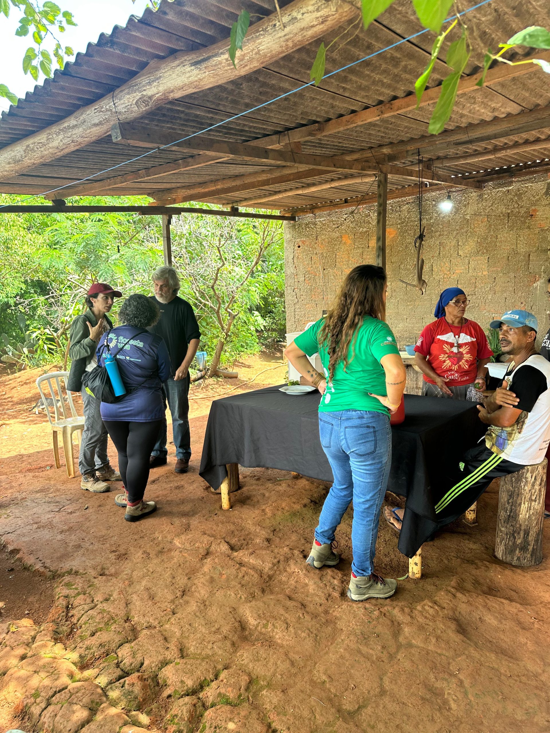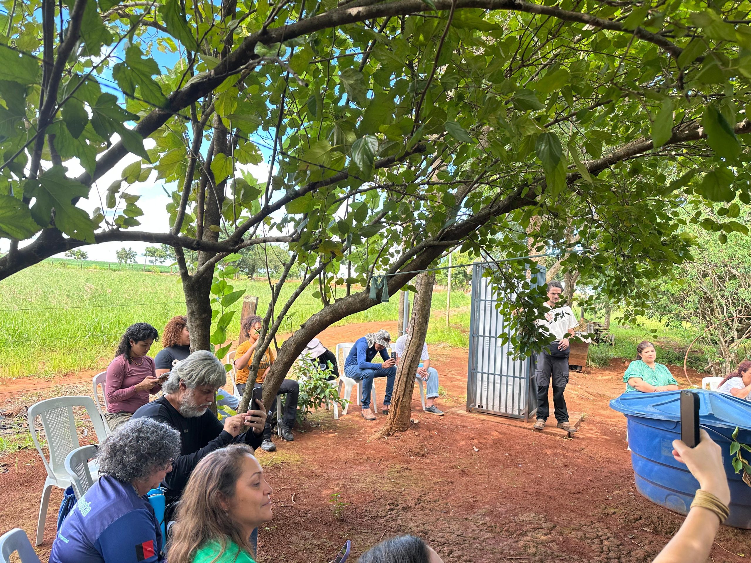 Para apresentação do sistema produtivo, os participantes realizaram visitas em duas áreas. Estiveram na propriedade da Dona Inês Santos e seu Sandro Santos, bem como da dona Emilene Paiva, onde foi possível conhecer outro contexto de implantação dos SACEs e participar de uma muvuquinha com o plantio coletivo de sementes nativas do Cerrado.