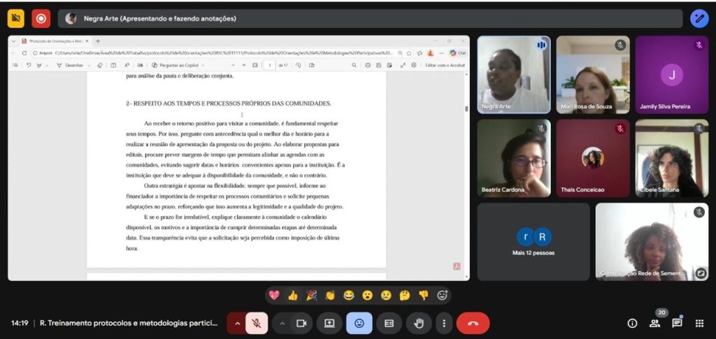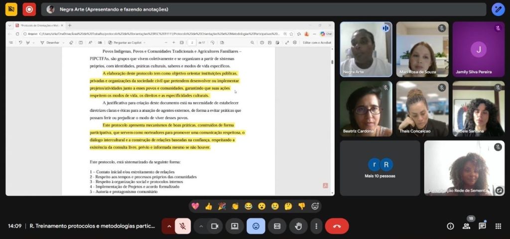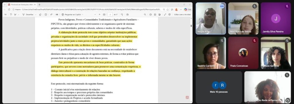 O encontro foi conduzido por Sirlene Barbosa, consultora responsável pela elaboração do Protocolo de Orientações e Metodologias Participativas, documento construído de forma coletiva e que reúne princípios éticos e caminhos práticos para o trabalho em territórios tradicionais e rurais.